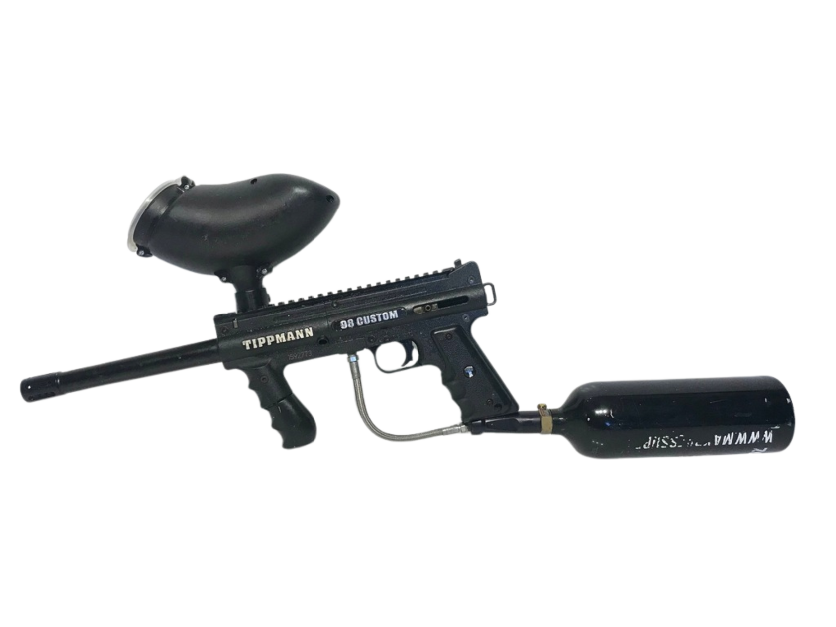Основна частина спорядження в пейнтболі являє собою варіант пневматичного пістолета, який використовує робочий газ (зазвичай стиснене повітря (азот) або вуглекислий газ) для стрільби пейнтбольними кулями.